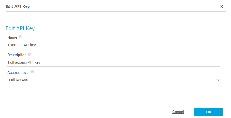 After creation, you can edit the name, the Name, the Description, and the Access Level of your API keys.