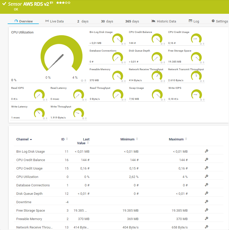 The AWS RDS v2 sensor monitors the performance of a Amazon Web Services (AWS) Relational Database Service (RDS) database by reading its data from Amazon CloudWatch via the AWS API.