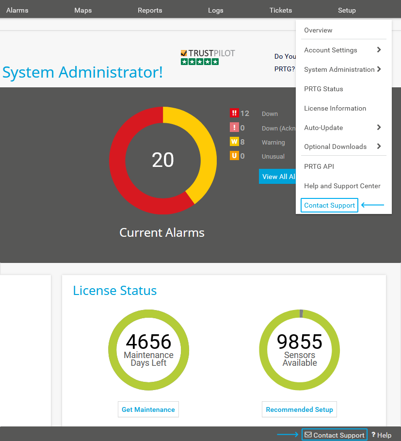 The Contact Support feature is only available for users with an active maintenance plan with their PRTG Network Monitor, PRTG Enterprise Monitor, or PRTG Hosted Monitor license. This feature is not available for freeware edition licenses.
