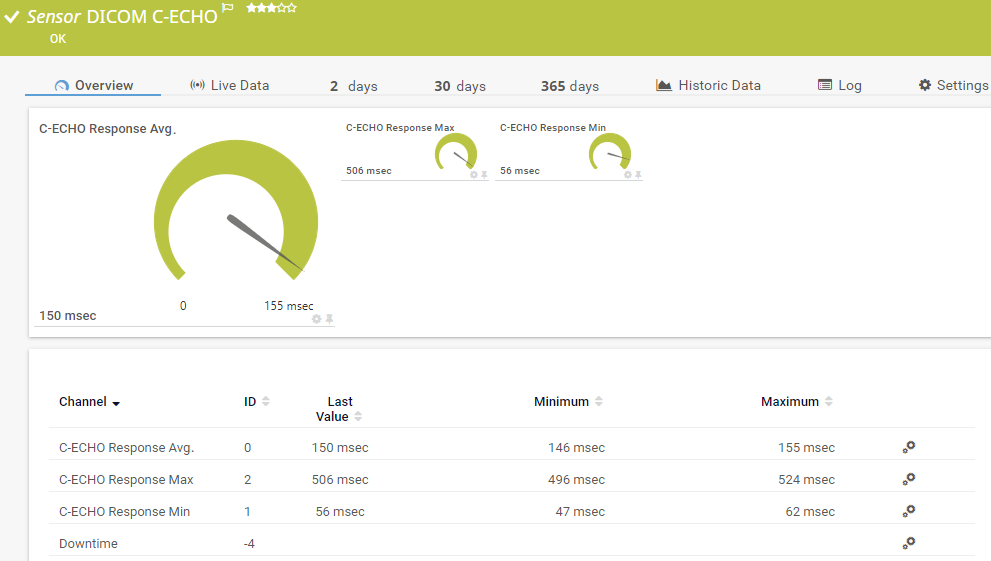 The DICOM C-ECHO sensor monitors the availability of Digital Imaging and Communications in Medicine (DICOM) capable systems and devices by sending C-ECHO requests to the target system. C-ECHO is also known as DICOM-Ping.