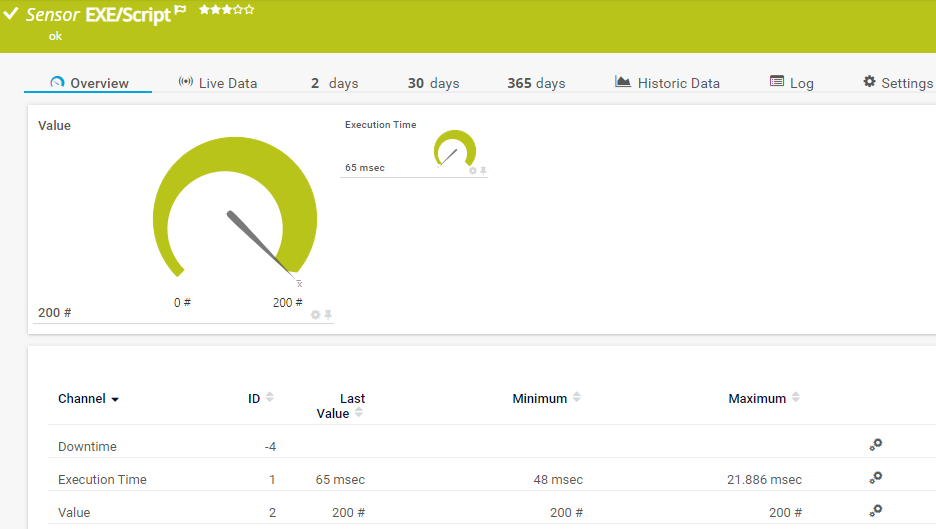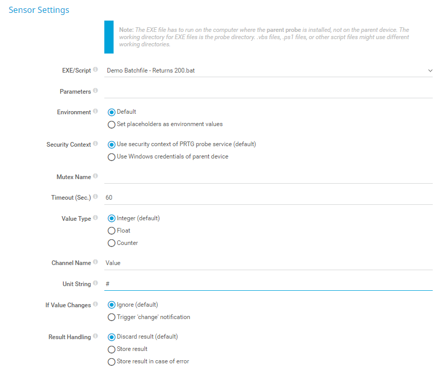 The EXE/Script sensor runs an executable file (.exe) or a script (batch file, VBScript, PowerShell) on the probe system. This option is available as part of the PRTG API.