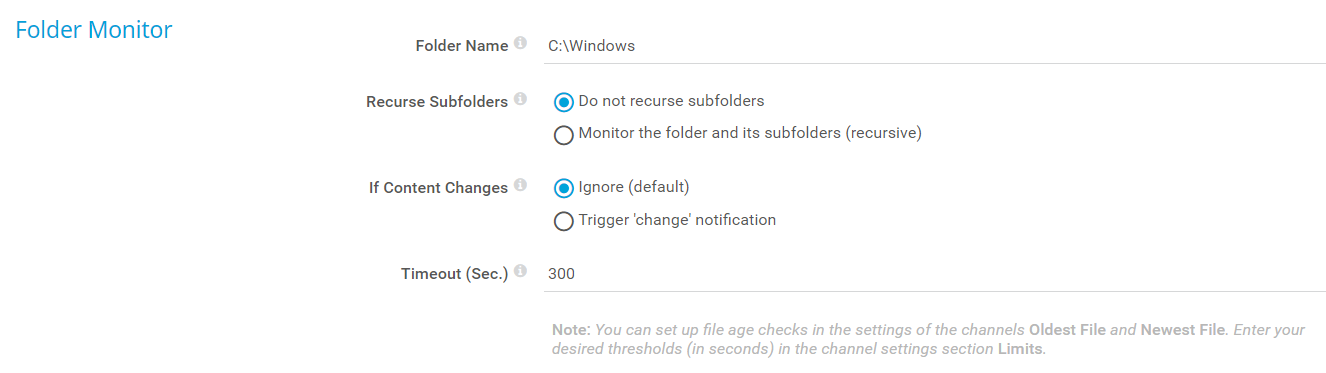 • Show down state if older: Set the sensor to the Down state if one of the files in the folder is older than a specific limit unit.