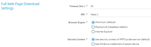 Internet Explorer: With each scanning interval, the URL is loaded in the background in an instance of Internet Explorer. PRTG uses the Internet Explorer of the probe system. For full functionality, we strongly recommend that you install at least Internet Explorer 11 on the probe system. If you select Internet Explorer as browser engine, you might face issues with the creation of temporary files. In this case, we recommend that you use the Chromium or the PhantomJS browser engines. For more information, see the Knowledge Base: Why is my HTTP Full Web Page sensor generating so many temporary files?