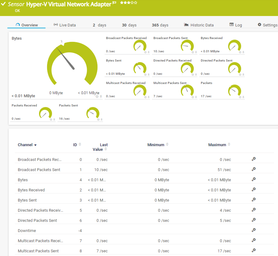 The Hyper-V Virtual Network Adapter sensor monitors virtual network adapters that run on a Microsoft Hyper-V host server via Windows Management Instrumentation (WMI) or Windows performance counters, as configured in the Windows Compatibility Options of the parent device.
