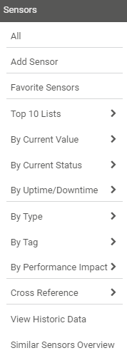 Open a list of sensors filtered by different parameters. Hover over By Uptime/Downtime to show other options. Follow the menu path to view lists of all sensors sorted by