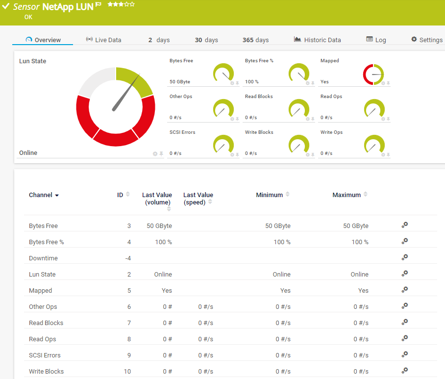 This sensor supports NetApp cDOT as of version 8.3 or ONTAP from versions 9.0 to 9.12. If you want to use ONTAP as of version 9.6, use the NetApp LUN v2 sensor.