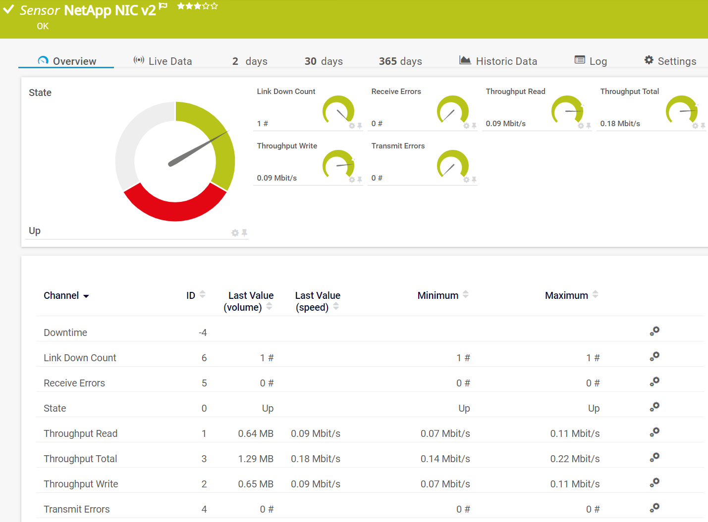 In the channel table on the Overview tab, this channel never shows any values. PRTG uses this channel in graphs and reports to show the amount of time in which the sensor was in the Down state