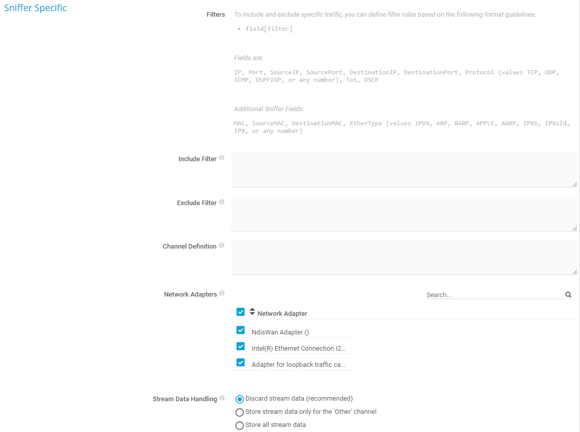 • Discard stream data (recommended): Do not store the stream and packet data.