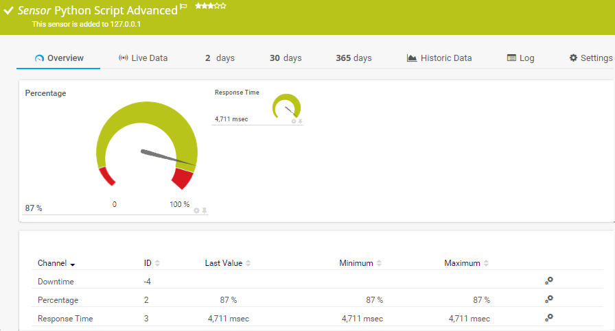 In the channel table on the Overview tab, this channel never shows any values. PRTG uses this channel in graphs and reports to show the amount of time in which the sensor was in the Down state