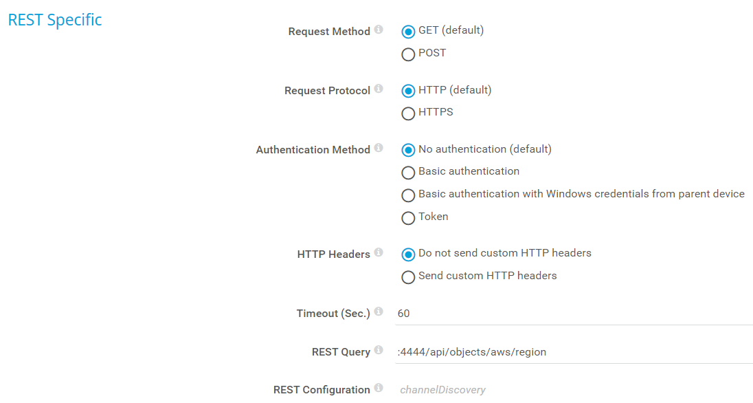The default REST configuration file is channelDiscovery. If you select this file, the sensor parses the returned JSON or XML and automatically creates channels based on available values: one channel for each number and boolean for strings if they are convertible into numbers.