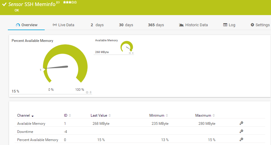 In the channel table on the Overview tab, this channel never shows any values. PRTG uses this channel in graphs and reports to show the amount of time in which the sensor was in the Down state