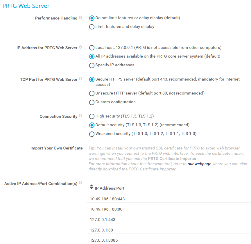 Shows all active combinations of the IP addresses and ports on which the PRTG web server listens for web requests.