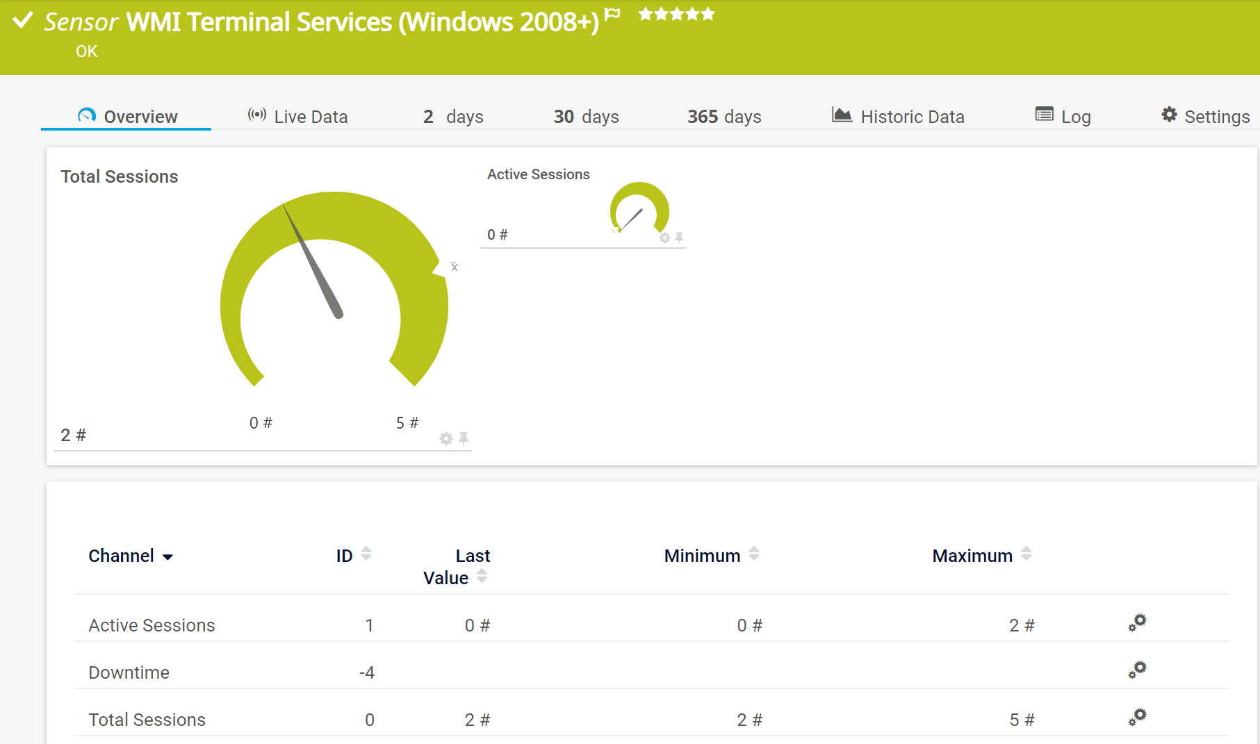 i_round_blueFor the Total Sessions channel, the sensor returns the number of active and inactive sessions, plus two additional sessions: one for the console, and one for the services. So, the number of total sessions might actually be higher than expected.