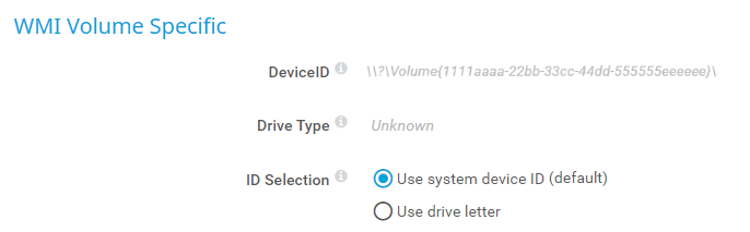 Use system device ID (recommended): Use the system device ID. This is usually the best option for this sensor because the device ID does not change when the volume is renamed.